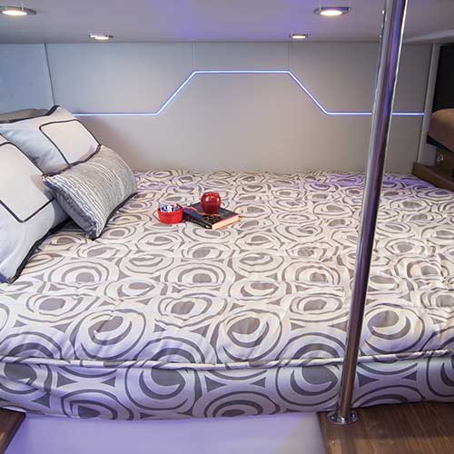 The aft cabin stateroom with privacy curtain features a permanent queen-size bed with Sensus memory foam mattress, so there is no need to fix up a lounge for primary sleeping. The upholstered headboard with individual reading lights and hideaway storage, pillow shams, additional wall LaunchPort inductive charging system, dual USB charging port and deep storage area at the foot of the bed make this a perfect retreat. The 32” LED/LCD HDTV with soundbar and Blu-ray player and additional storage behind complete the stateroom amenities.