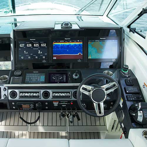 The durable composite dash comes with various useful features like the Raymarine twin eS128 GPS widescreen color chart plotters, which you can choose to upgrade to triple gS165s. Other dash features include the following: